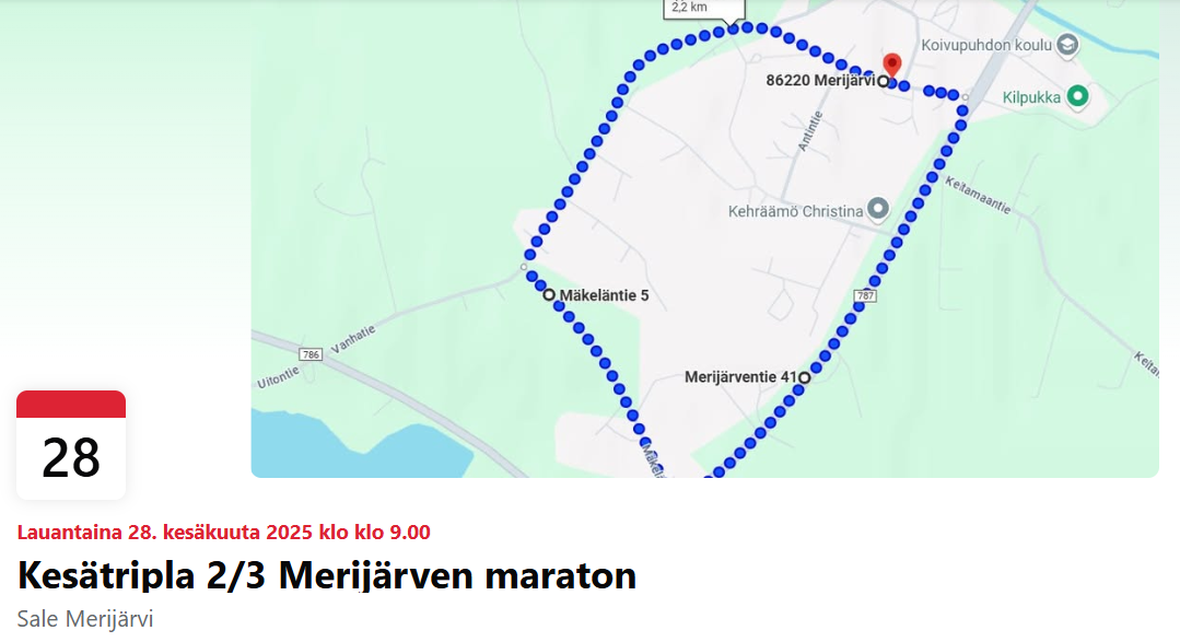 Kesäkuun triplan toinen startti nautitaan Merijärvellä jossa tarjolla on kylän ympäri 2.2 km reittiä 19 kertaa ja pikkuinen ketunlenkki päälle. Reitillä oleva Merijärven Sale on auki lauantaisin 7-18 joten huoltotäydennys onnistuu mainiosti.