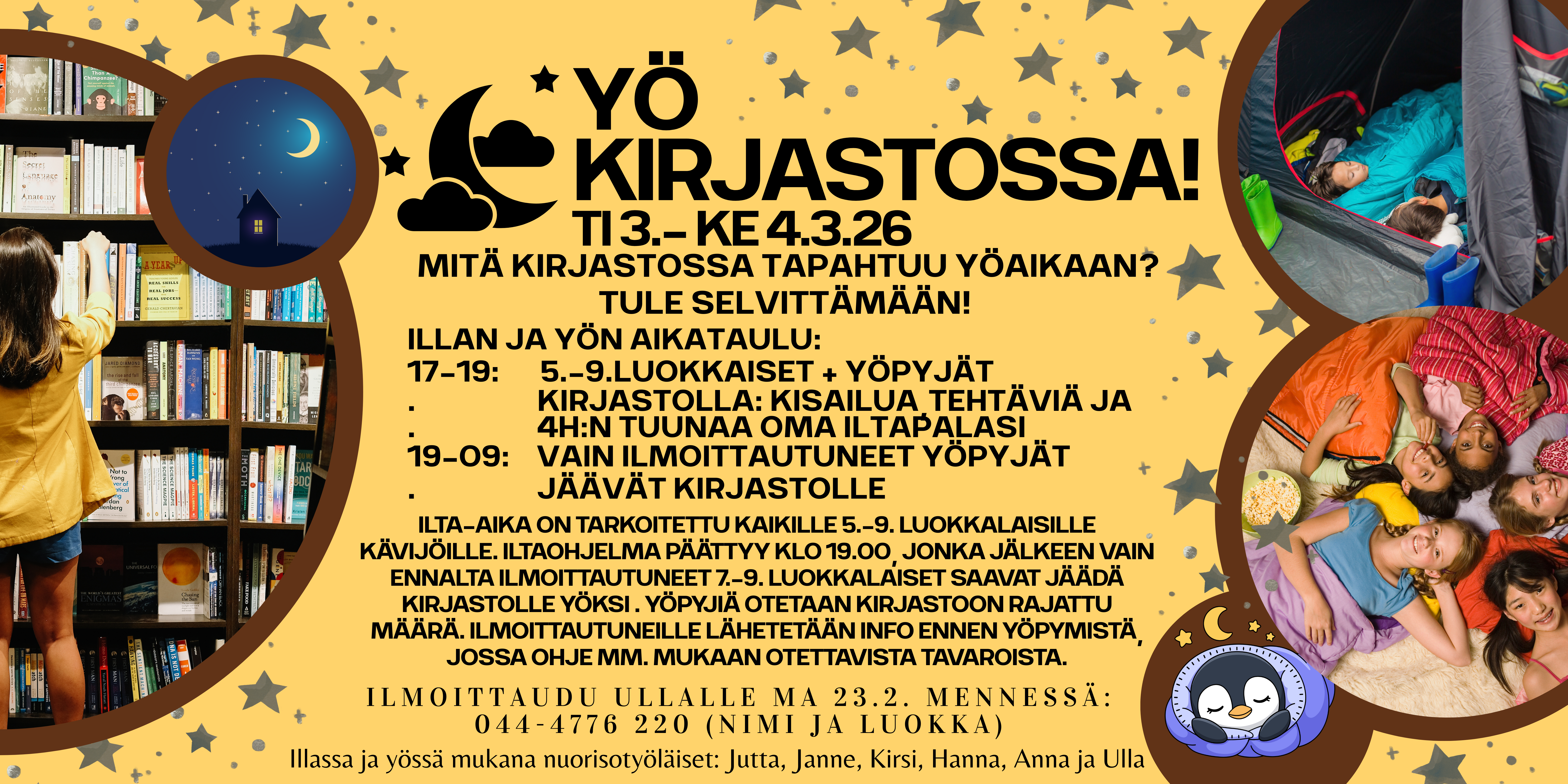 Ilta-aika on tarkoitettu kaikille 5.-9. luokkalaisille kävijöille. Iltaohjelma päättyy klo 19.00, jonka jälkeen vain ennalta ilmoittautuneet 7.-9. luokkalaiset saavat jäädä kirjastolle yöksi . yöpyjiä otetaan kirjastoon rajattu määrä. Ilmoittautuneille lähetetään info ennen yöpymistä, jossa ohje mm. mukaan otettavista tavaroista.