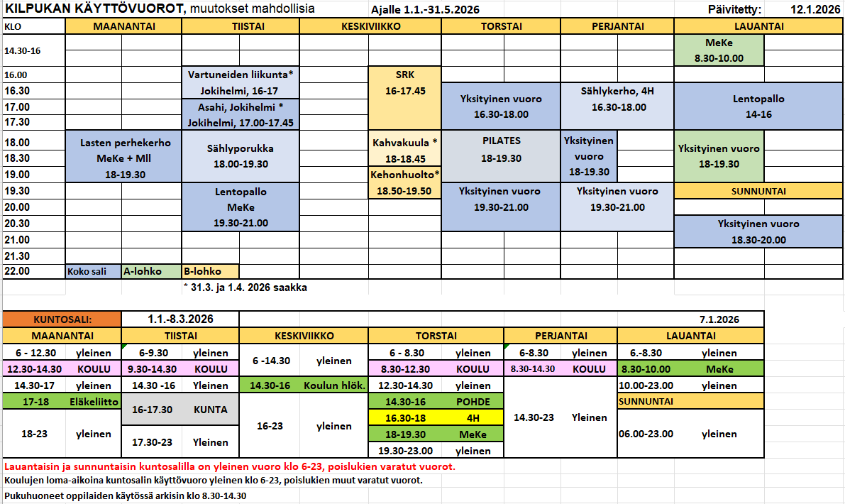 Kuntosalivuorot kevät 2026 (päiv. 12.1.26)