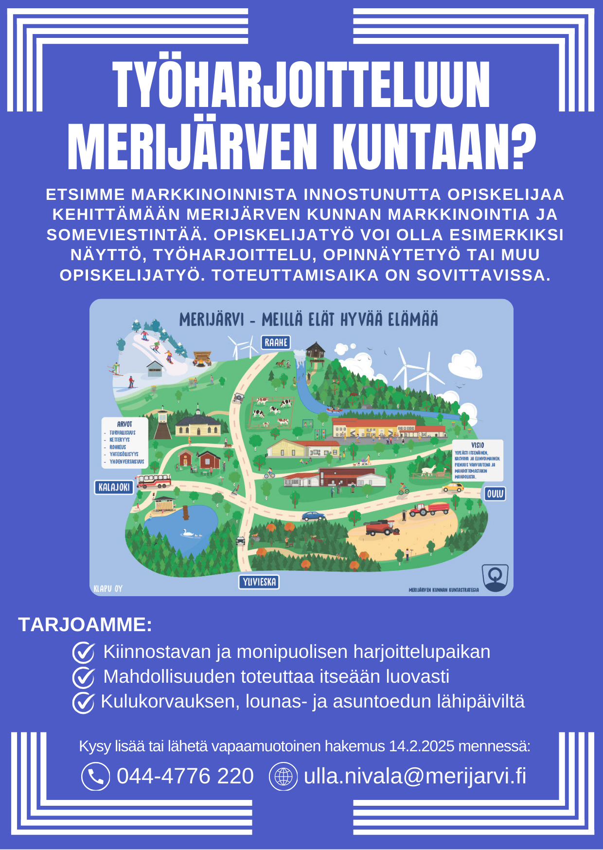 Etsimme markkinoinnista innostunutta opiskelijaa kehittämään Merijärven kunnan markkinointia ja someviestintää. Opiskelijatyö voi olla esimerkiksi näyttö, työharjoittelu, opinnäytetyö tai muu opiskelijatyö. Toteuttamisaika on sovittavissa.